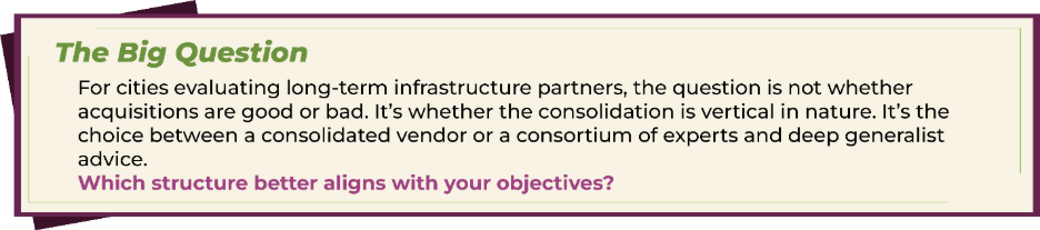 The three-layer model highlighted in Part 1 offers a resolution to this tension. Cities do not have to choose between the administrative simplicity of a single relationship and the performance benefits of specialization. What they need is an accountable partner, one with the depth and breadth to govern a specialized ecosystem on their behalf. That partner manages the coordination complexity, so the city does not have to.