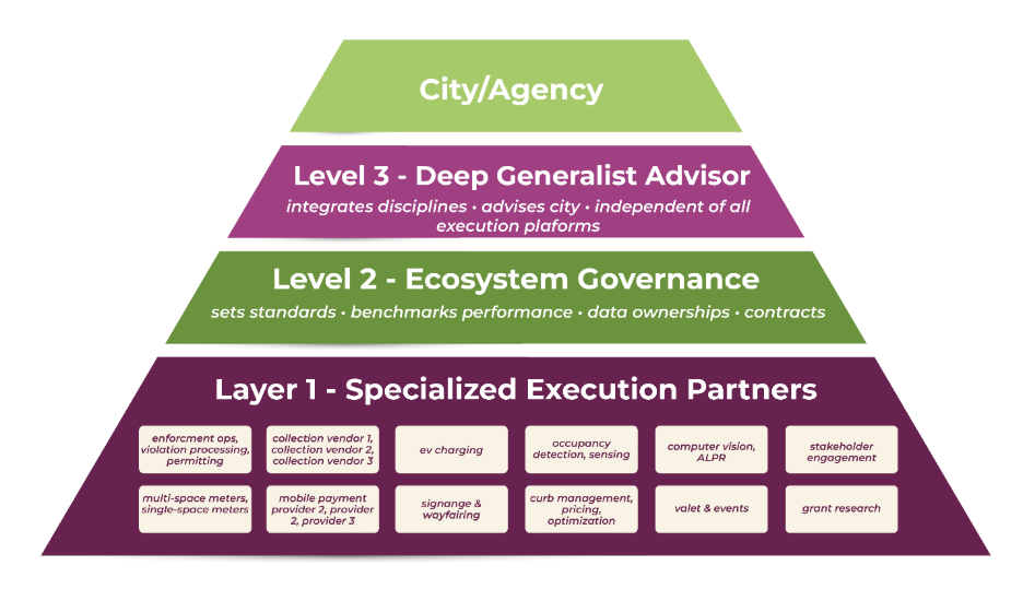 This is where a deep generalist plays a critical role. Not as a critic of any particular vendor, but as the presence who can surface performance trends. A deep generalist can ask the questions that a vertically integrated vendor cannot ask of itself: Is our routing serving the city's safety priorities or another's margins? Is our pricing advice reflecting the city's revenue needs or a vendor’s transaction fees? Are we building toward the city's long-term flexibility or a company’s switching cost advantage?