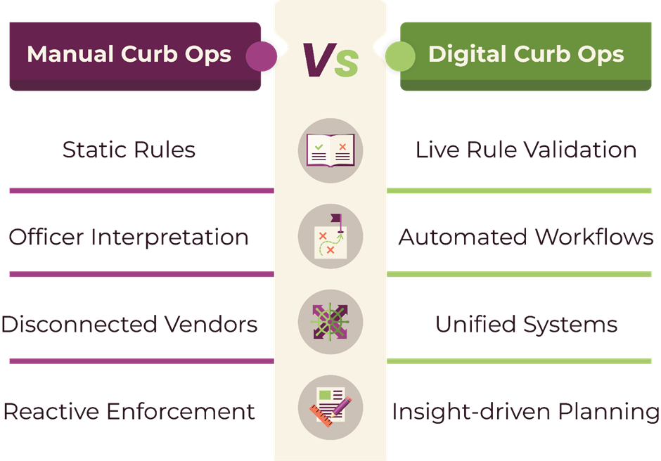 A truly digital curb changes how parking and curbside operations function day-to-day. It shifts both from a manual, interpretive model to a data-driven, automated one: